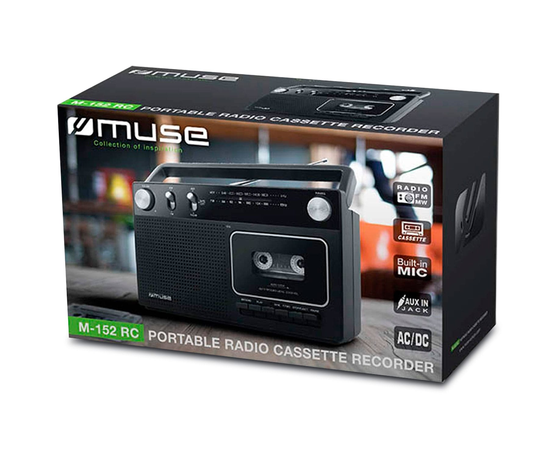 Radio cassette portátil MUSE M152RC en color negro con altavoz y micrófono integrados, sintonizador AM, FM, antena telescópica y reproductor / grabador de cassette, conexión jack 3.5, funciona con pilas 6x C (no incluidas)