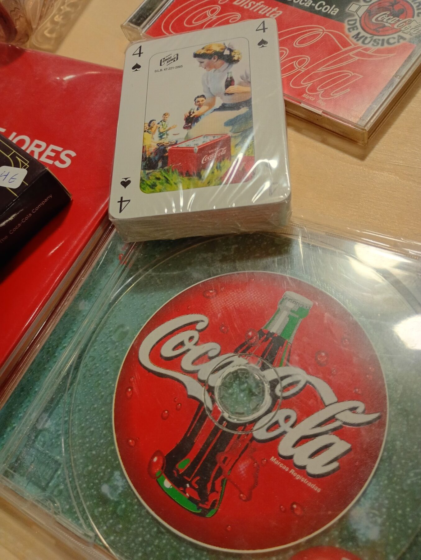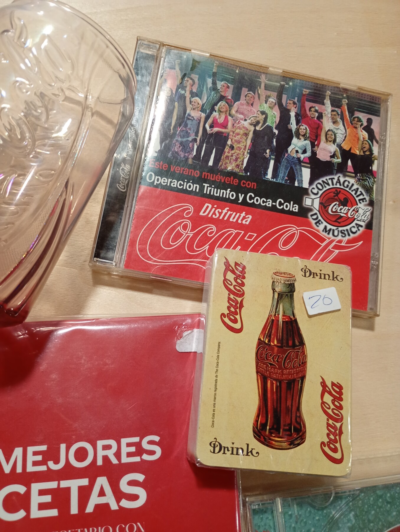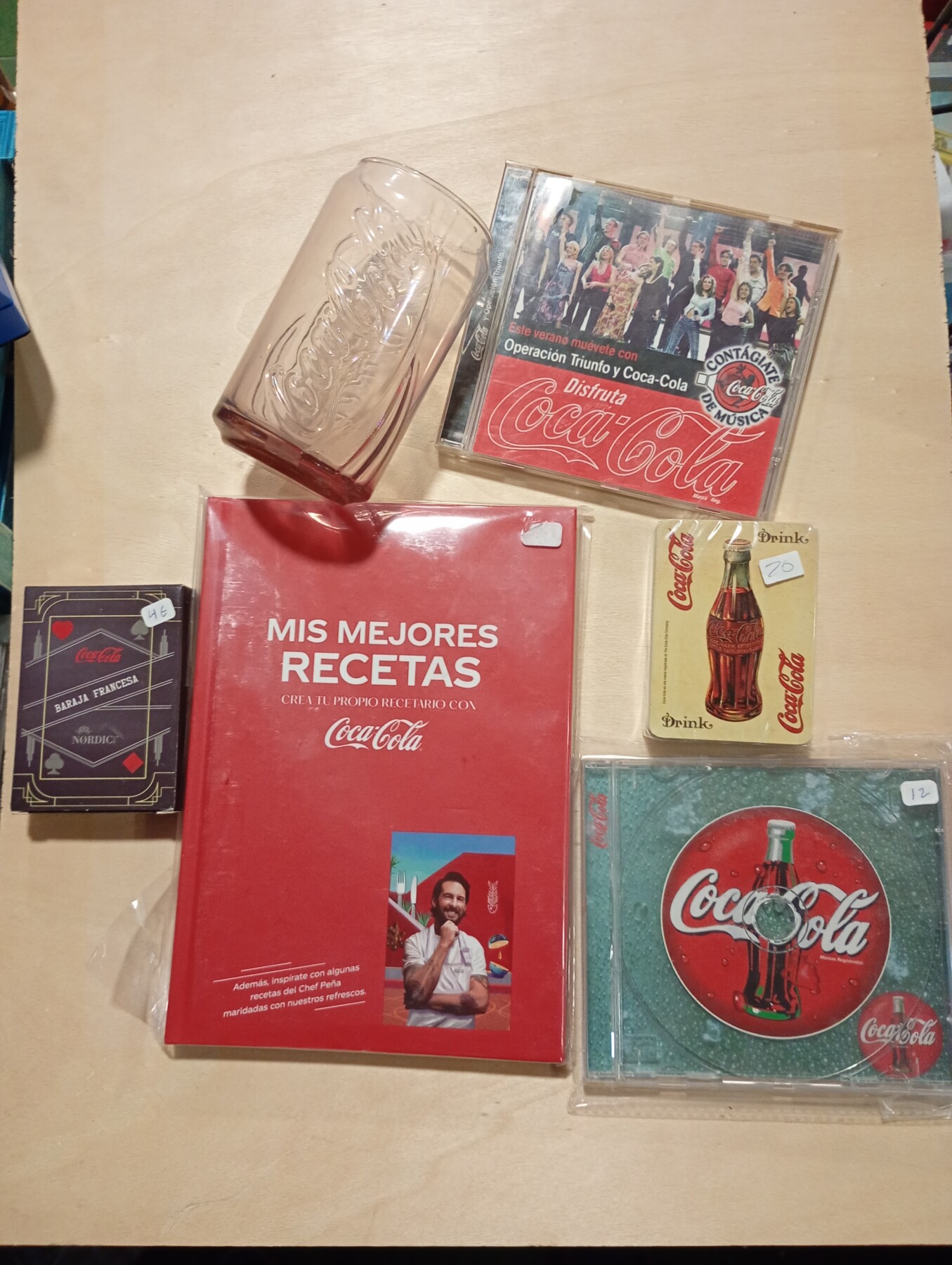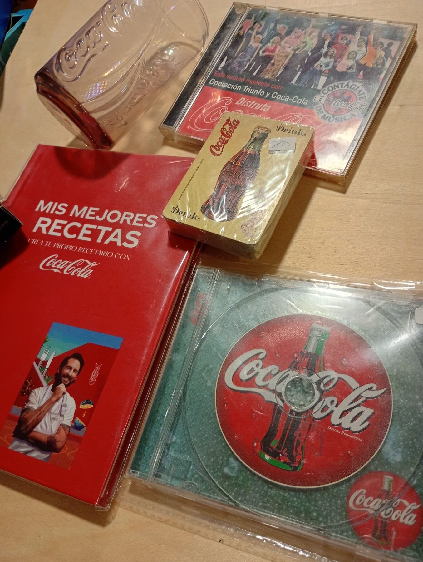 Lote coleccionismo COCA-COLA, Libro recetas, cd’s, barajas de cartas y vaso de cristal