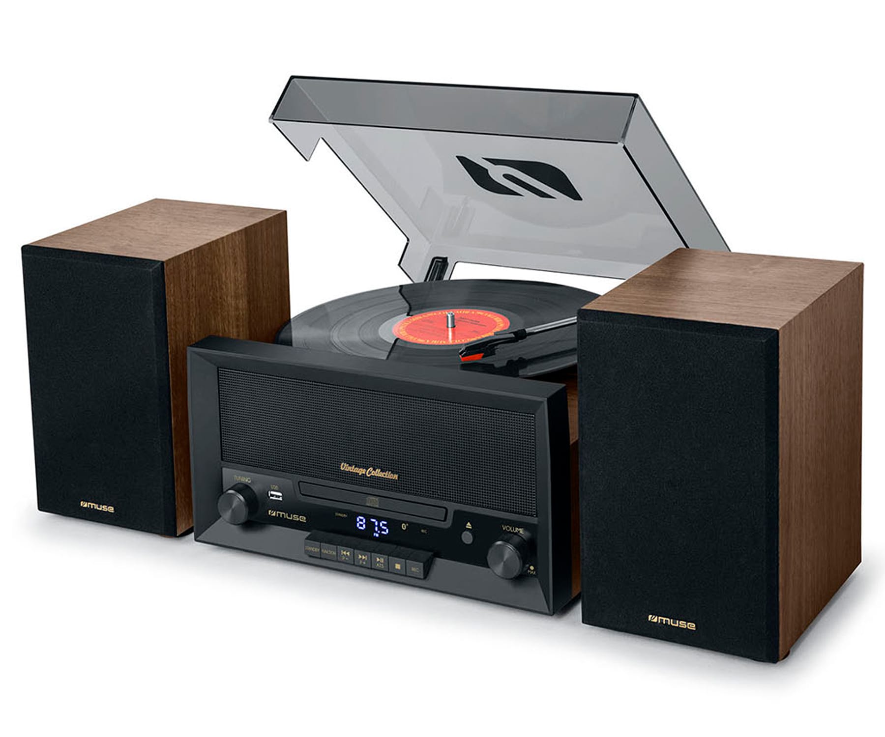 Minicadena tocadiscos radio y cd con altavoces separados MUSE MT-120 MB WOOD Madera