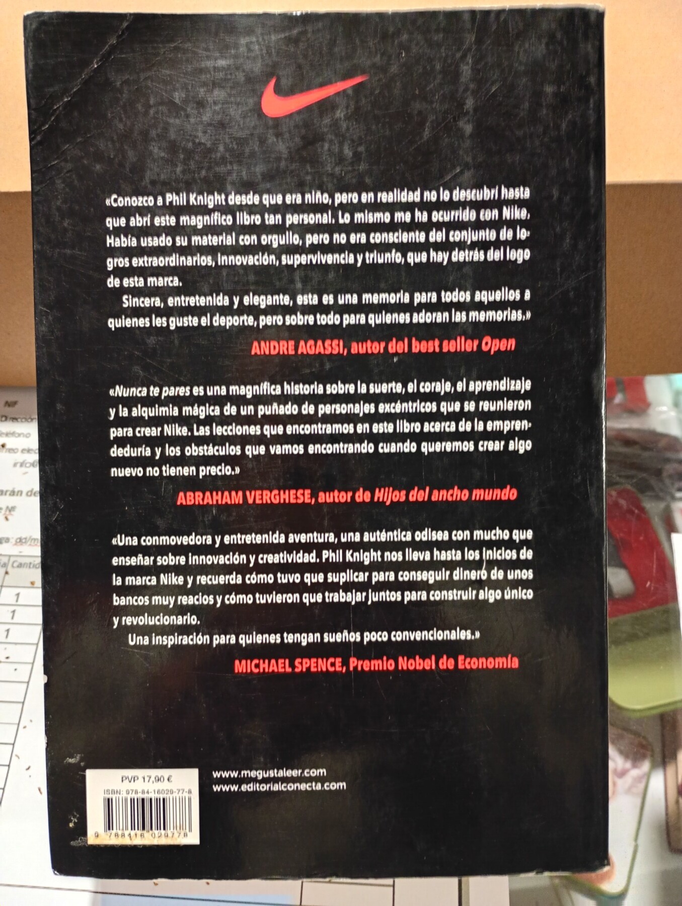 “Nunca te pares” es la autobiografía de Phil Knight, el tipo que convirtió una idea casi ridícula —importar zapatillas japonesas desde el maletero de su coche— en Nike, uno de los imperios culturales más grandes del planeta. El libro no es un manual de emprendimiento al uso: es una historia cruda, llena de dudas, riesgos absurdos, amistades intensas y decisiones tomadas al borde del abismo. Knight muestra que Nike nació más de la obsesión y la terquedad que de un plan perfecto. Es un relato honesto, humano y sorprendentemente vulnerable sobre perseguir algo que te quema por dentro y no parar nunca, incluso cuando todo apunta a que deberías hacerlo.