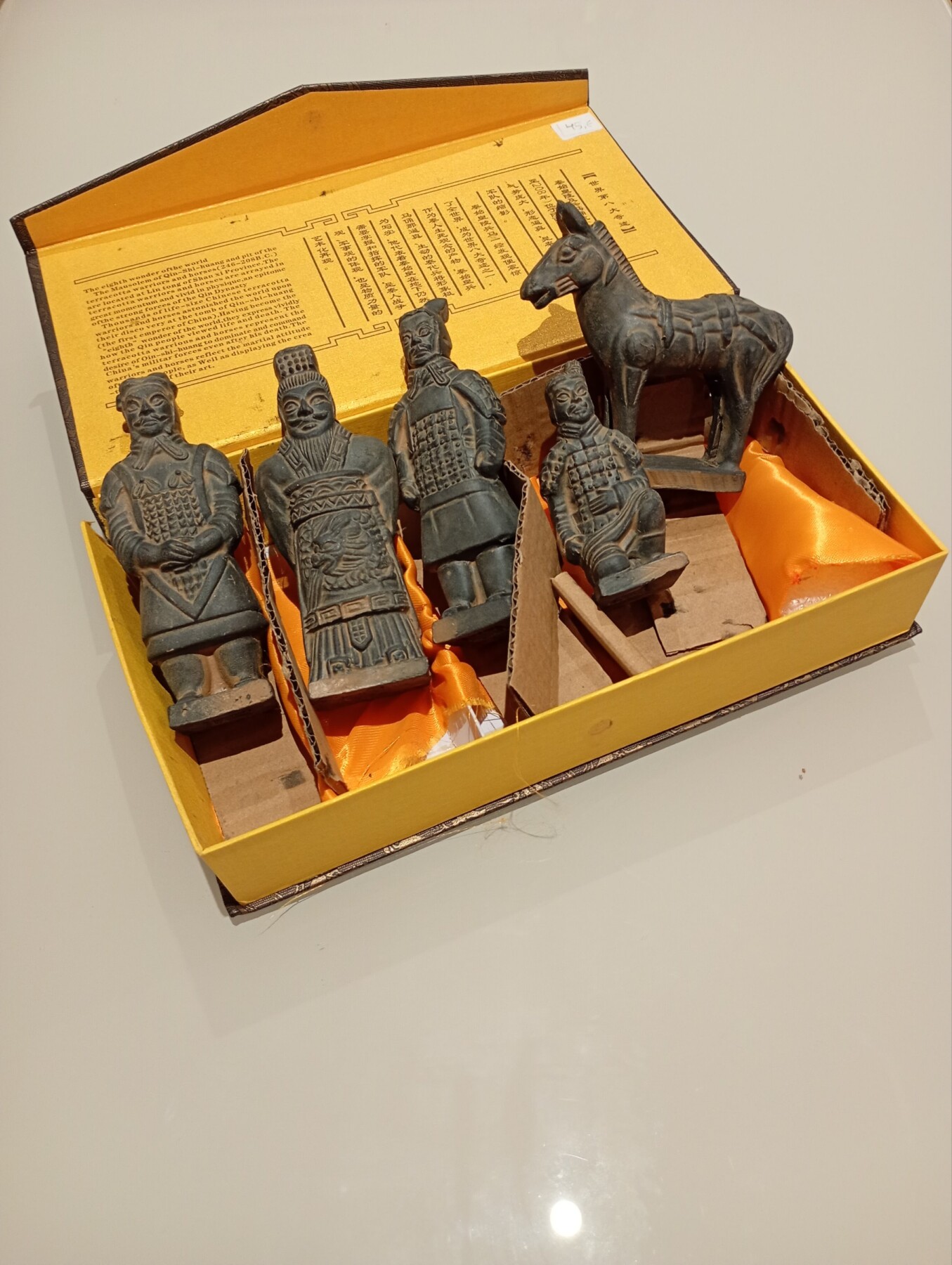 Preciosas estatuillas chinas réplicas de los legendarios guerreros de terracota. Presentadas en una bonita caja decorada. Regalo ideal para amantes de la historia oriental y de la arqueología.