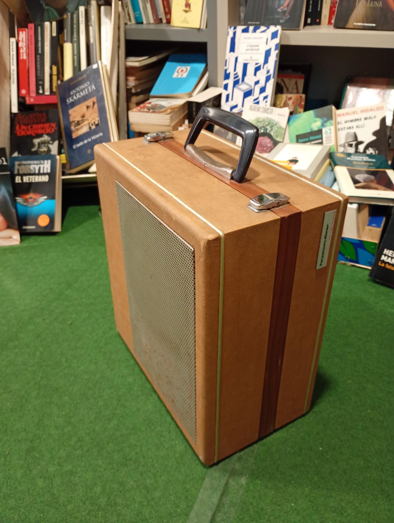 - Altavoz y maleta: La maleta que se ve junto al tocadiscos es probablemente el altavoz compañero, lo que indica que se trata de un sistema de tocadiscos portátil integrado o un sistema estéreo compacto.